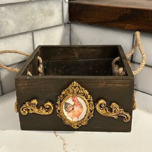 Hand painted 6” x 3.25” wooden box. Small clay pictures of chickens/Roosters. Rope handles. Can be used as a planter, decorative box to hold eggs on your counter and many more uses. Plants, eggs not included. Come with plastic lining.