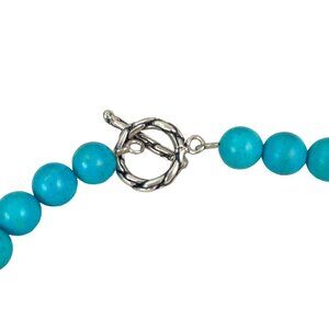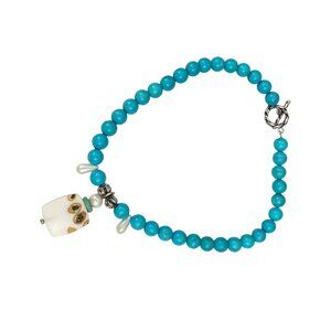 This necklace features vibrant Faux turquoise beads, complemented by a unique ceramic pendant adorned with intricate designs. Metal accents and pearl-like beads add a touch of elegance. Ideal for those who appreciate handcrafted jewelry.