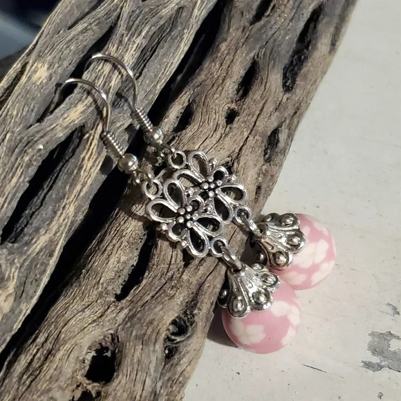 Handcrafted Fimo Clay Light Pink White Flower Beads Antique Silver Earrings