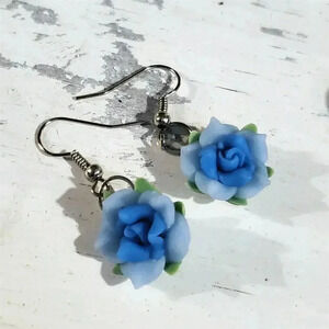 Handcrafted Fimo Polymer Clay Blue Rose Flower Bead Dangle Earrings