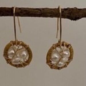 โจ Absolutely stunning, handcrafted dangle earrings by Plata Jewelers. These unique "Dream Catcher" style earrings feature lustrous freshwater pearls and delicate moonstone, intricately wire-wrapped in a beautiful gold tone. ๐๐