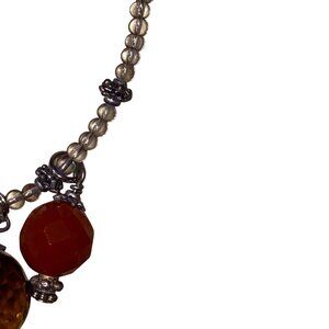 This elegant bracelet features a sophisticated blend of gemstones, including earthy greens and warm oranges, complemented by shiny silver accents. The secure clasp ensures durability, making it a stylish addition to any accessory collection.