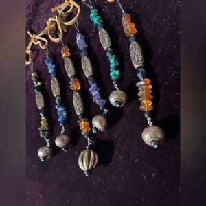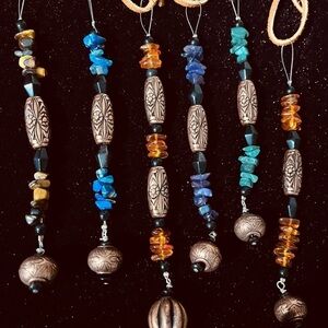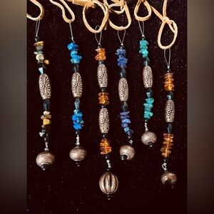 This is a set of 6 beautiful artisan one-of-a-kind handcrafted hand strung Garland ornaments. Genuine semiprecious sones of Lapis Lazuli, Tiger Eye, Amethyst, Amber and Malachite strung with simulated cupper beads and onyx beads finished with genuine leather. These ornaments are so beautiful hanging from your tree. Can also be hung from your rear-view mirror, bag, or another place where you need inspiration. Hang them all together or separate for individual gifts.