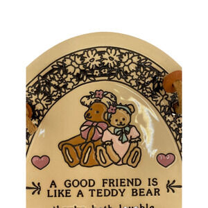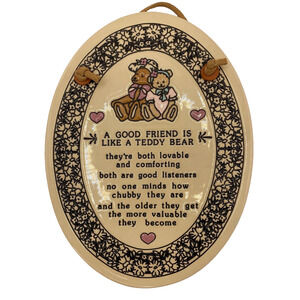 Add a touch of artistry to your wall with this exquisite Trinity Pottery Friends Oval Wall Plaque. Made in the USA, this handcrafted ceramic plaque features intricate carvings, a 3D effect, and is hand-painted to create a unique piece of art. Measuring 7.25 inches in length and height, and 5.5 inches in width, this plaque is perfect for all occasions and suitable for both teens and adults. The multicolored glazed finish adds to the beauty of this masterpiece, depicting the subject of friendship and teddy bears. With its vertical orientation, it can be easily mounted on the wall, making it a great addition to your decorative collectibles. This plaque is customizable and weighs only 9 oz.