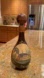 Dimensions: Approximately 12 1/2 inches tall from bottom to top of bottle stopper which is made of woodand 4 inches wide. Notice the raised leather detail? Different color of leathers. It’s a beauty. We are changing decor and this one is hard to let go.
