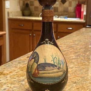 Vintage Italian glass decanter by Fausto Confuri in Italy Florence. Decanter is wrapped in leather, featuring a mallard duck print.