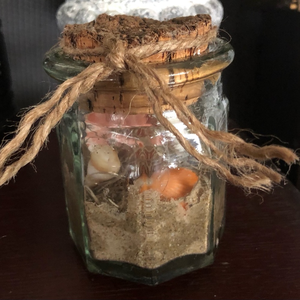 4 1/2” X 3 1/2” Glass Jar with Sealed Cork Lid Sand and Shells inside