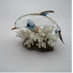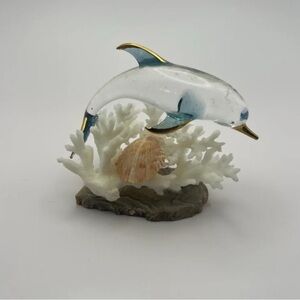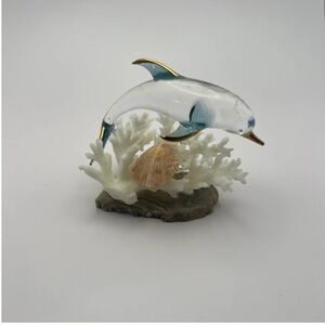 Beautiful handcrafted glass dolphin figurine purchased at an arts fair. The dolphin is made of clear glass with delicate blue accents and gold detailing on the fins, tail, and nose. The dolphin appears to swim over a realistic coral base, adding an ocean-inspired coastal vibe to any decor. Perfect as a collectible, coastal home decor accent, or gift for ocean lovers.