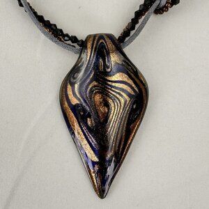 This elegant necklace features a unique glass pendant with swirling patterns, complemented by a beaded and braided cord. It adds sophistication to your attire.