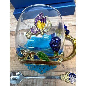 Add some class to your tea time with this elegant glass tea cup. The golden handle and butterfly design say, "I'm fancy, but approachable."