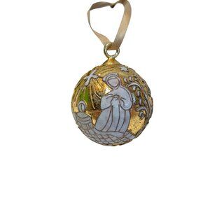 This ornament displays a serene nativity scene with detailed gold and white accents. Crafted with care, it adds elegance and spiritual significance to holiday décor. Its ribbon loop ensures easy hanging on trees or displays. Suitable for gifting or personal collection, it embodies traditional festive charm.