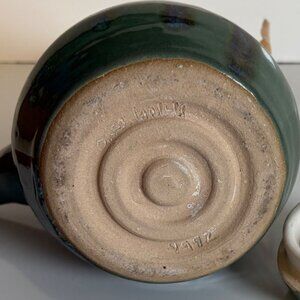 Handcrafted Green Pottery Teapot Rattan Handle Artisan-Made Signed