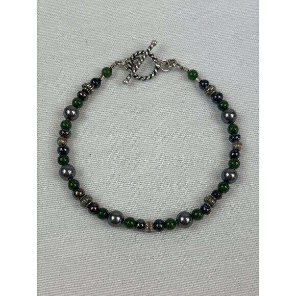 This elegantly handcrafted bracelet features a combination of green and silver-grey beads and silver metal beads, creating a timeless and versatile accessory. The toggle clasp ensures secure wear, making it easy to put on and take off.