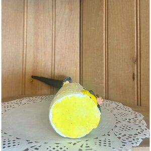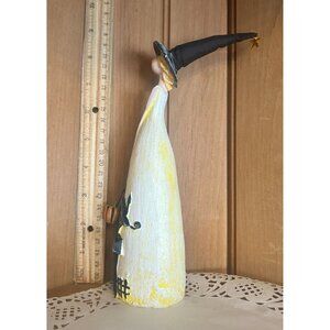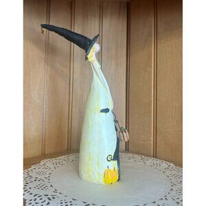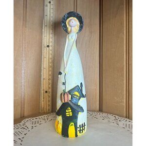 This handcrafted figurine combines artistry and seasonal charm, depicting a witch with a whimsical house and pumpkin details. The hat is made of fabric and has a small yellow metal star attached at the end. For those that prefer a less scary festive display.