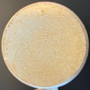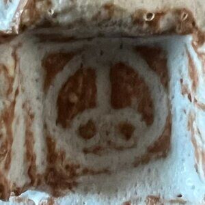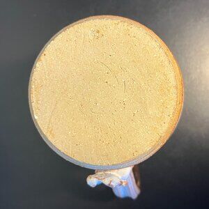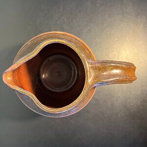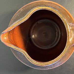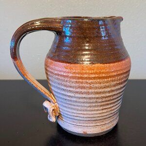Handcrafted hand thrown studio pottery water pitcher, both functional and decorative, showcasing a rounded earthtone body and a unique rustic feel. Features earthy brown, sand, and red earth tones and a subtly ribbed texture. The interior and upper third of the exterior glazed in a dark brown finish that extends over the handle. The mid and lower portion has a matte beige glaze overlaid with terra cotta color especially on the mid section. Exquisite long handle folded at the base and topped with an incised maker’s mark that resembles a vertical line with a loop at the bottom on each side inside a circle.) Unglazed bottom. Measures 6” tall; 6.5” across including handle; 3.25” opening at the top including spout. Weighs 2 lb. 3.75 oz. Holds 28 fluid oz.