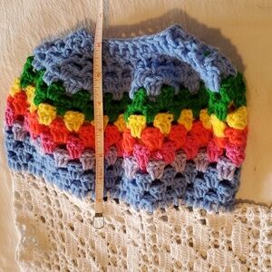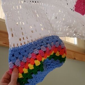 NEW...Vibrant crochet dress featuring rainbow sleeves and colorful patches. Perfect for a bold statement. Check out all pics for details and approximate measurements.