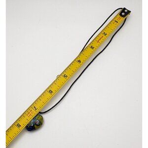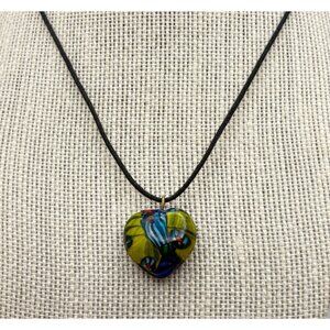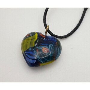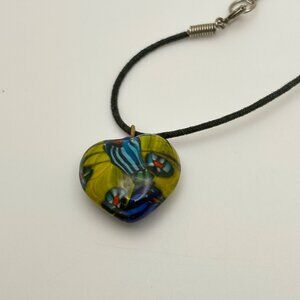 This necklace showcases a vibrant, handcrafted glass pendant in a heart shape, suspended on a sleek black cord. The unique design offers a colorful and artistic flair.