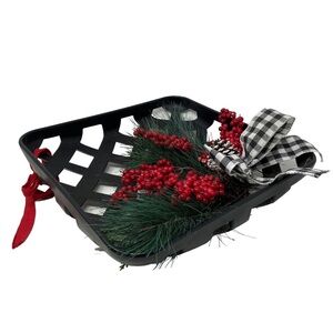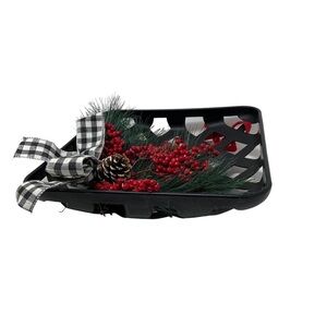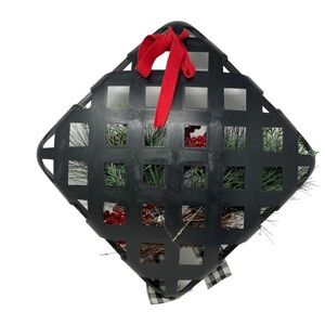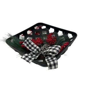 Great condition. Like new. Smoke-free environment. Black plastic bin. Checked bow. Pine cone. Berries and pine needles.