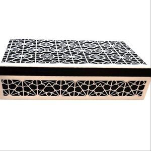 Elegant black and white decorative box with intricate patterns. Perfect for storage or display.