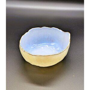 This elegant handcrafted bowl features a unique iridescent finish with a soothing blue interior and soft cream exterior. The delicate gold trim and scalloped edges add a touch of sophistication, making it a stylish addition to decor or functional for serving snacks or trinkets.