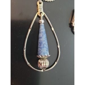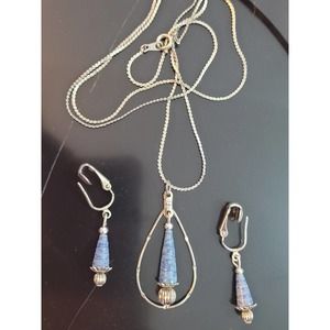 Beautiful denim blue pendant centered in a silver loop. Earring match the beautiful denim blue and are drop CLIP style