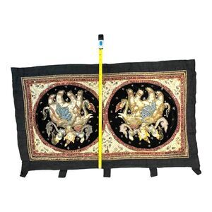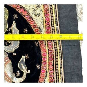 This handcrafted Kalaga vintage tapestry features heavy embellishments, stones, and an elegant elephant design. The Unbranded piece sports a black and gold color scheme.