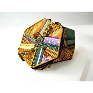 My embellished Keepsake boxes are created with recycled and re-purposed materials that generally consist of vintage fabric, jewelry, gemstones ribbon, old greeting cards and anything else I can find! For these reasons each box is One of A Kind.