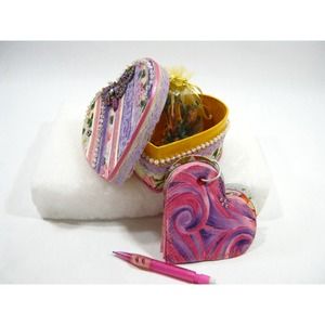 My embellished keepsake, prayer memento boxes with handmade Journal is a gift and a spiritual journey, a place to express brief thoughts, and store small keepsakes of the heart. These fun boxes are created with refurbished re-purposed materials that generally consist of vintage fabric, jewelry, gemstones ribbon, repurposed old cards and anything else I can find! For these reasons each box is one of a kind. Your box is accompanied by a mini Journal. Each coordinating mini journal / diary is about 20 pages and includes hand dyed paper, motivational messages and space for making special notes. A mini mechanical pen or pencil is included with fresh handmade potpourri which will give the box a light floral scent. The boxes are about 4 inch wide x tall- the interior is painted and sealed for durability making it perfect for storing small photos mementos, jewelry or small desk items.