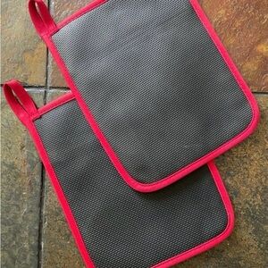 Protect yourself while whipping up masterful meals and delectable desserts in the kitchen! These pot holders feature a unique blend of rubber and polyester that is designed to fight off heat. These amply quilted pot holders keep your wrists and hands away from hot surfaces and are a safe and simple way to prevent unnecessary burns. With a sturdy loop hanger, they can easily be stored within reach or in a drawer out of sight, and the color is sure to pop, no matter your style of decor.