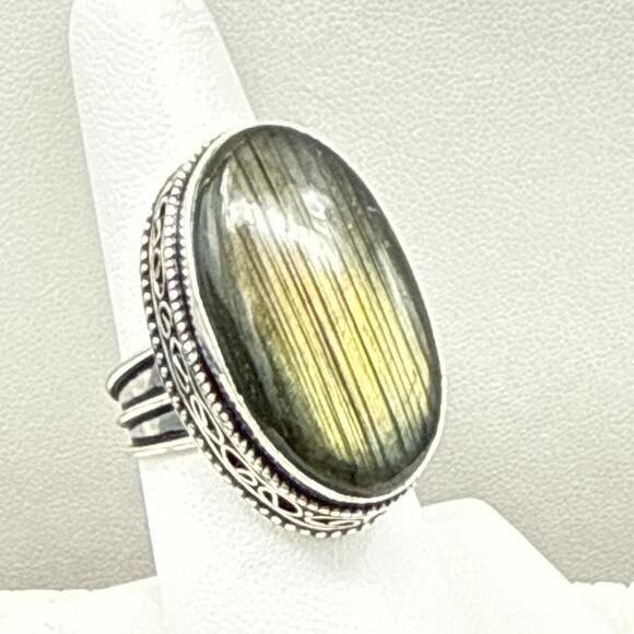 Handcrafted Labradorite Ring Size 7.5 Green Yellow Cabochon Silver Tone Band