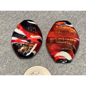 Handcrafted Lampwork Glass Beads - Red Black & Gold Glitter Swirl 2 Pcs Oval Sha