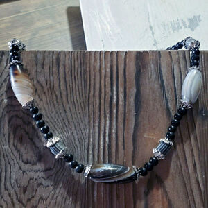Handcrafted Botswana agate necklace is about 18" longLarge prized Botswana agate beads are about 32x13mm eachNatural agate stones will be different on each necklace and each beadAcrylic and glass bead accentsSilver tone bead caps, lobster claw clasp, and extender chain