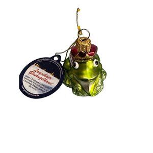 This handcrafted glass ornament from Lauschaer showcases a charming frog adorned with a regal crown and red cloak, adding a festive and whimsical touch to holiday decor.