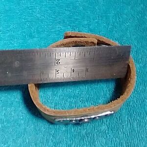Unique leather bracelet featuring metal accents. Earthy tones with artistic design.