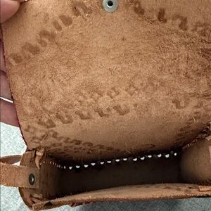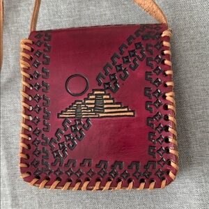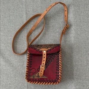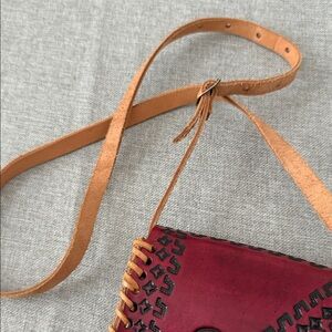 This handcrafted leather crossbody bag features a striking red and tan design. Perfect for adding a touch of elegance to any outfit.