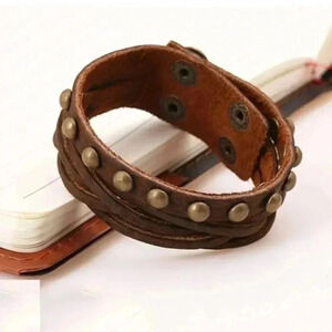 Handcrafted Leather Studded Celtic Viking Pirate Cuff Snap Brown Bracelet NWT