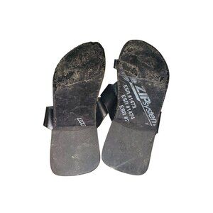 Visible sole wear and scuffs on the sandals. Measurements: length = approximately 10.25 inches, width = approximately 4 inches.