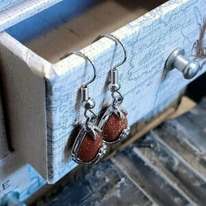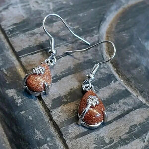 Handcrafted Little Teardrop Brown Goldstone Gemstone Platinum Plated Earrings