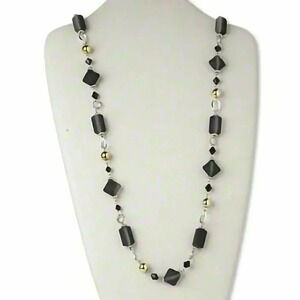 Handcrafted Long Black Gold and Silver Geometric Beads NecklaceBlack acrylic beads, gold coated acrylic beads, and silver steel beedsSingle 37" long loop (no clasp)Wear long, knotted, or doubled over