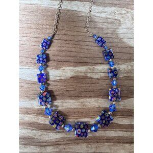 Handcrafted Millefiori Glass Necklace With Adjustable Chain & Floral Blue Beads
