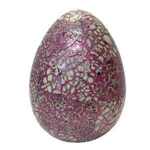 Handcrafted in Vietnam, these mosaic ceramic decorative eggs are full of color and texture. Each measures approximately 6.5 inches tall by 5 inches wide. One features a glossy green scale-like pattern reminiscent of leaves or dragon eggs, while the other has a cracked mosaic design in shades of purple, pink, and ivory with a geode-like effect.