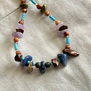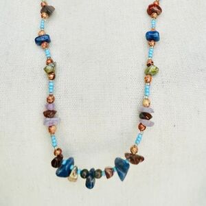 Long strand of stone smooth chip stone multicolor beads. I don’t recall of the stones I used but definitely rose quartz, jasper, unakite. I believe sodalite and tigers eye. Wear as a singe strand or wrap for a bracelet.