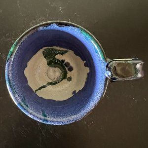Handcrafted pottery mug with exterior and interior glazed in hues of blue, green, purple, and beige. Features a comfortable thumb rest on the handle. Measures 3” tall with a 3.5” diameter; Measures 5.” across including handle. Holds 8 fluid oz.