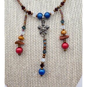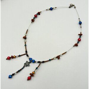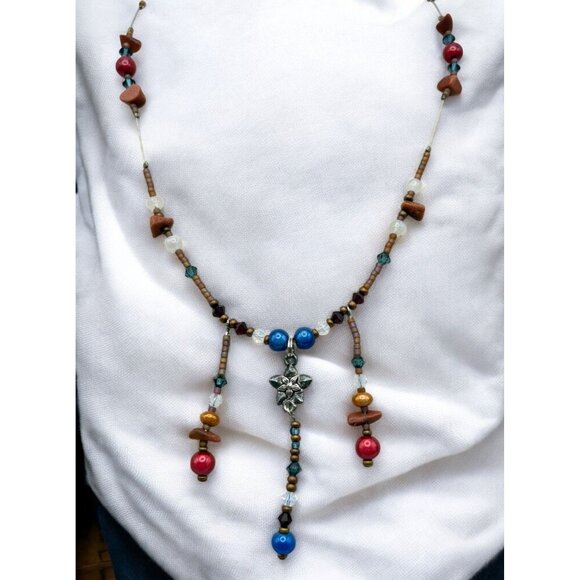 Handcrafted Multicolor Beaded Necklace with Silver Tone Flower Accent Boho