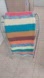 This vibrant crochet blanket showcases a striped pattern incorporating yellow, green, brown, red, blue, orange, purple, brown, and cream. Designed for comfort, it is ideal for creating a cozy atmosphere.