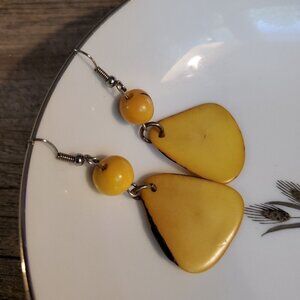 Handcrafted Muted Yellow Peruvian Tagua Nut Slices Round Beads Teardrop Earrings