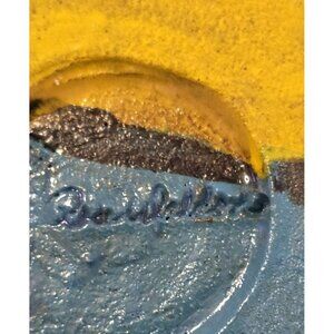 A Native American ceramic bowl painted in bold hues of yellow, blue, and red, featuring a sun above waves. Signed by the artist (couldn't make out the name), it captures the serene beauty of a sunrise. Its handmade, artistic touch makes it a meaningful addition to your collection or table setting.