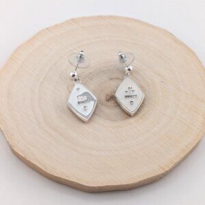 Elevate your accessory game with these vibrant Navajo handmade sterling silver earrings, featuring a modern geometric design with stunning multi-stone inlay. Handcrafted and signed by Pamela Daniels. Each earring is beautifully crafted with vibrant stones including turquoise, spiny oyster shell, lapis lazuli, and mother of pearl, creating a bold and colorful mosaic set in polished sterling silver.