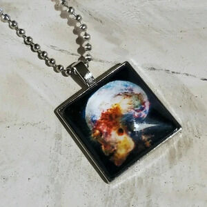 Handcrafted Nebula Skull Square Glass Cabochon Pendant Necklace