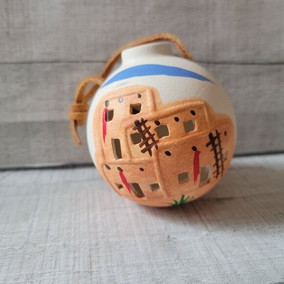 Handcrafted New Mexico Pueblo-Themed Ceramic Ornament With Leather Loop
